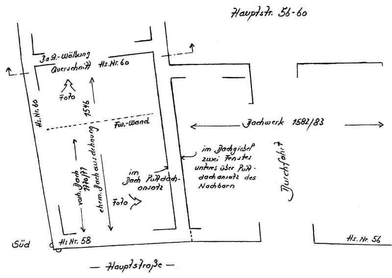 Die Ausformung des zeitlich später folgenden Ersatzdaches ist gleich zweimal belegt. Orientiert am hoch liegenden Firstpunkt, verbunden mit den Putznasen der beiden abfallenden Dachneigungen, handelte es sich bei dem zweiten Dachwerk um ein Satteldach. Reste dieses Dachwerkes blieben über dem Baukörper von Haus Nr. 60 noch erhalten. Abgezimmert in den Jahren 1546/47 (d), überdachte es ursprünglich beide Hausteile. Mit seinem Firstverlauf war es in Westost-Richtung ausgerichtet, bevor es im Osten rechtwinklig nach Norden schwenkte und dort an die Brandwand zu Haus Nr. 56 anschloss.