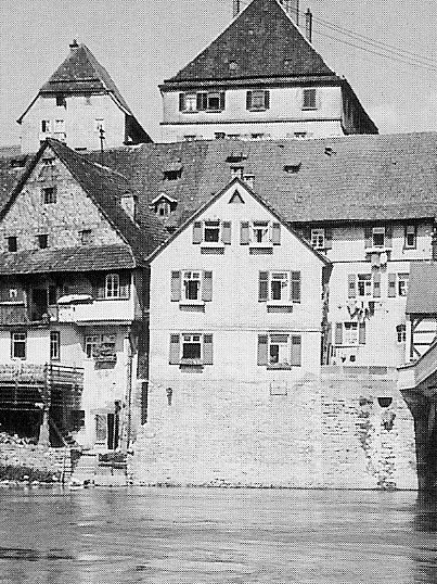 Nach dem Häuserbuch wurde das Anwesen anstelle eines durch Hochwasser abgegangenen Vorgängers erbaut und steht direkt neben dem ehemaligen Enzbrückentor. Zum Vorgänger gehörte einst auch das Torhaus. Im Innern soll sich noch ein älterer Keller befinden. Bedingt durch die Ecklage an der überregionalen Chaussee (Hauptstraße) wurde das Gebäude abgeschrägt errichtet.