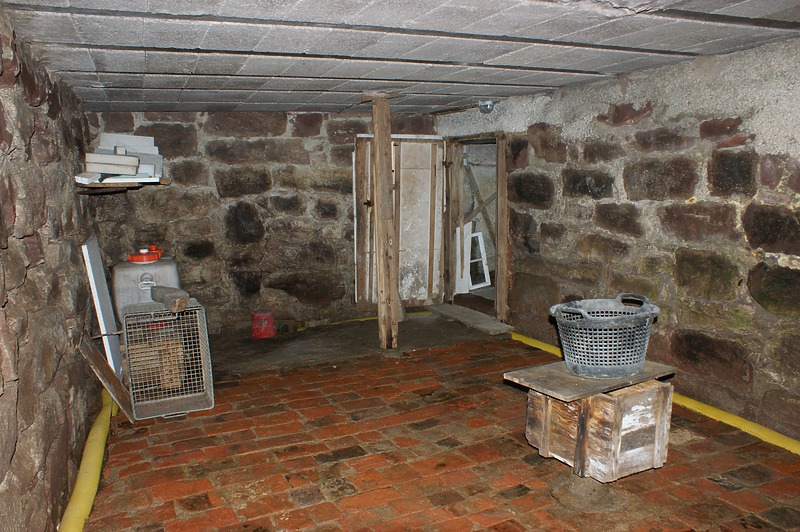 Erschlossen wird der Wohnteil durch einen schmalen Flur. Hier liegen neben der Treppe nach oben die Zugänge in die drei giebelseitigen Wohnräume, wobei die Küche die mittige Lage, zwischen der Stube und der später umgenutzten und unterteilten Kammer einnimmt.