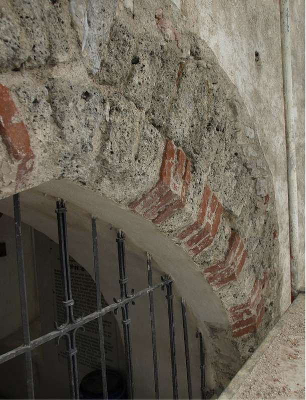 Der Eingangsbogen beschreibt einen gedrückten Spitzbogen, der durch den Wechsel aus Tuffsteinen und Backsteinen eine eigenwillige Gestaltung erfahren hat. Er wird außen und innen von breiten Fasen begleitet, die unten in Schrägschnitten auslaufen und deutlich machen, dass keine Verschlussmöglichkeit vorgesehen war. Oberhalb dieses Bogens spannt sich ein weiterer sehr viel substantiellerer Bogenlauf, der erst etwas höher ansetzt und aus weniger sauber bearbeiteten Steinen gefügt ist. Er wirkt als Entlastungsbogen für den aus Werk- und Backsteinen zusammengesetzten Bogen, der alleine wohl kaum genügt hätte die Last des darüberliegenden Mauerwerks aufzunehmen und sollte nicht sichtbar in Erscheinung treten.