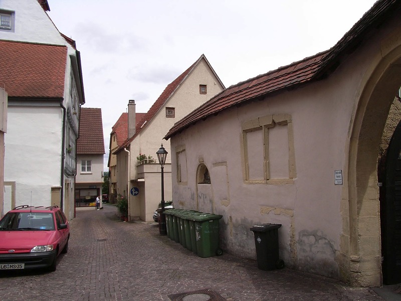 Die schmale Quergasse besitzt mit dem im Kern aus dem 16. Jahrhundert stammenden Amtsgericht eine städtebaulich prägende Hofanlage, die sich gegenüber der Enzbrücke neben dem Rathaus als städtebauliche Dominante über die Stadtmauer erhebt. (a)