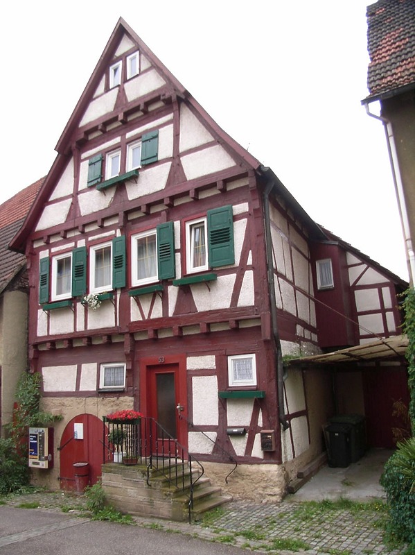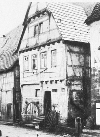 Zweigeschossiges Fachwerkhaus auf massivem Sockel, Rundbogen-Kellertor, Obergeschoss und Dachgeschosse jeweils vorkragend, Holzknaggen zum Obergeschoss, 2. Hälfte 16. Jahrhundert, spätere Umbauten, 1979 Renovierung.