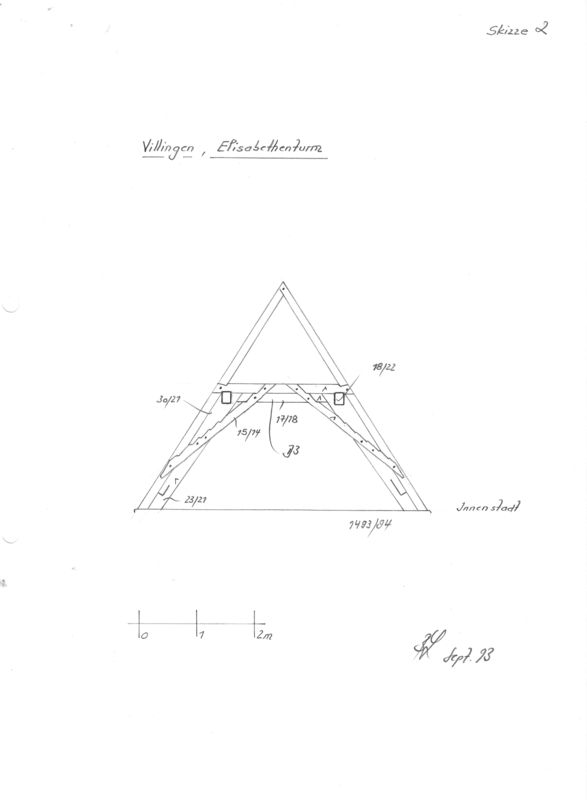 Der weitgehend verputzte Baukörper des Elisabethenturmes war nur im Dachbereich zu untersuchen. Hier hat sich der Restbestand einer liegenden verblatteten Stuhlkonstruktion erhalten. Diese stammt aus den Jahren um 1493 (d) und war ehemals Teil eines Steilgiebeldachs, dessen Dreiecksgiebel zu einem späteren Zeitpunkt abgebrochen und abgewalmt wurden.