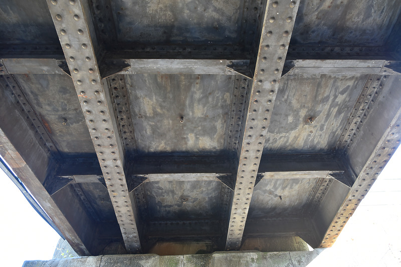 Der kleinere Überbau 1 besteht aus drei parallelen Hauptträgern und einem diagonal dazu verlaufenden westlichen Randträger mit angeschlossenem Radprofil mit bogenförmiger Bordüre. Überbau 2 besteht aus sieben parallelen Hauptträgern und einem ostseitigen Randprofil mit Zierform. Hier bilden alle Träger einen rechtwinkligen Rost aus. Die Träger bestehen aus Stahlwinkeln, die Rücken an Rücken mit dem Stegblech vernietet wurden. Sämtliche Nieten sind als geschmiedete Rundkopfnieten ausgebildet. Die Untergurte der Hauptträger wurden mit aufgenieteten Flachstahlbändern verstärkt, die der Nebenträger weisen eine sichtbare Mittelfuge auf.