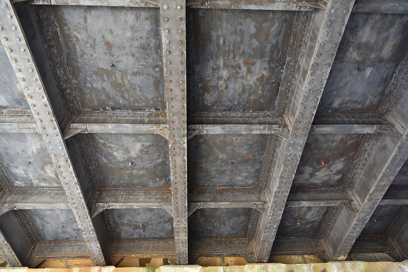 Der Trägerrost bildet leicht längliche Felder aus, die mit Buckelblechen geschlossen sind. Ihre Ränder sind auf die Obergurte des Trägerrostes aufgelegt. Jeweils mittig befindet sich ein integriertes Rohr, das die Entwässerung ermöglicht.
