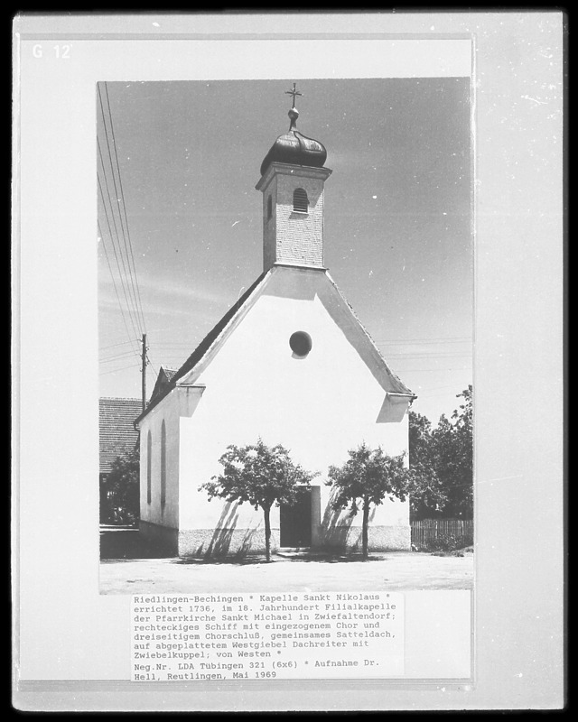 St. Nikolaus, Eingangsfassade mit Blickrichtung Nordosten / St. Nikolaus in 88499 Bechingen (1969 - Landesamt für Denkmalpflege Baden-Württemberg, Außenstelle Tübingen)