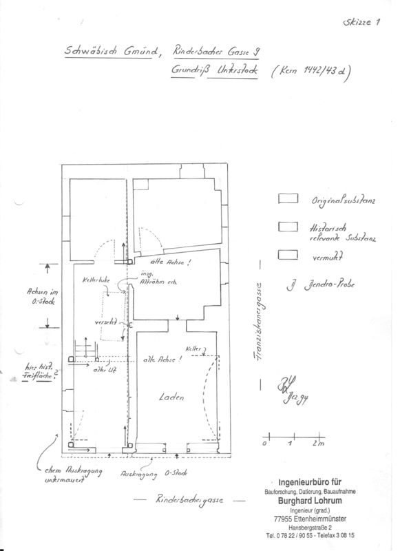 Das aus den Jahren um 1443 (d) stammende Gerüst gliedert den giebelseitige zur Rinderbachergasse ausgerichtete Unterstock in zwei Schiffe und drei Zonen. Ältere Bausubstand ist, abgesehen von einzelnen Gerüstständern, nur im Bereich der inneren Längsachse zu erwarten, da die Querwände keinen Bezug auf die ursprünglichen Achsen nehmen. Darüber hinaus wurde auch der Ladenraum nachträglich vergrößert, womit der Verlust bauzeitlicher Substanz einherging. Die ehemals an allen Seiten vorhandenen Auskragungen sind heute untermauert; alte Außenwandaufbauten werden nicht mehr vermutet.