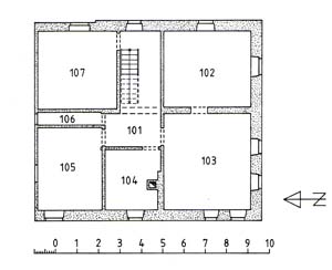 Trotz der eingeschränkten Untersuchungsmöglichkeiten kann der heutige Grundriss des Obergeschosses mit an Sicherheit grenzender Wahrscheinlichkeit als der des ersten Bauzustandes angesehen werden.