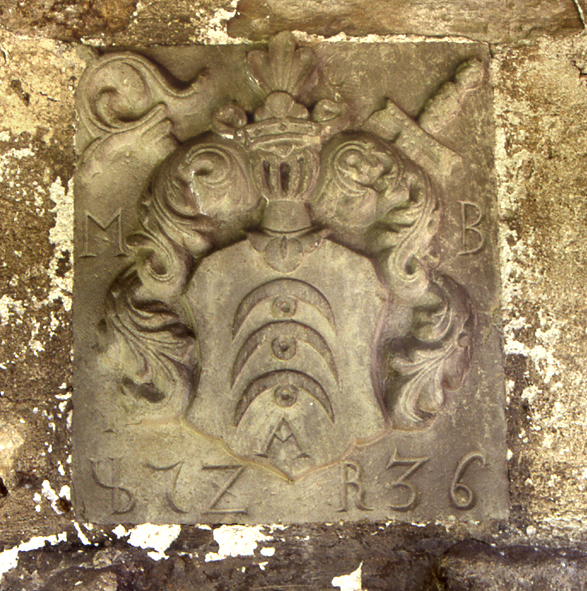 Die Außenwände wurden in den Eckbereichen besonders dick verputzt, sodass die Buckel nur noch als Beulen in Erscheinung traten, und mit einer Architekturmalerei versehen: in Schwarz, Grau und Weiß die weiteren Eckbereiche quaderiert und die Wandöffnungen gerahmt, zusätzlich mit Ocker das Rundbogentor in Form eines Portikus mit Säulen und bekrönenden Kugeln verziert, wovon sich neben Farbresten noch die Ritzlinien in größerem Umfang erhalten haben. Außerdem wurde über dem Tor ein Wappenstein mit Jahreszahl angebracht.