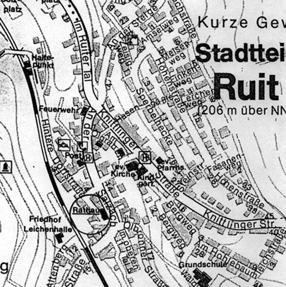 Das Rathaus in Ruit wurde urkundlich erstmals im Jahr 1622 erwähnt. Dieser Bau wurde 1726 wegen Baufälligkeit abgebrochen und durch einen Neubau ersetzt, wobei im EG Teile des ersten Baus verbaut wurden; es wird angenommen, dass das Erdgeschoss einst aus zwei Räumen mit einem mittigen Durchgang bestand.