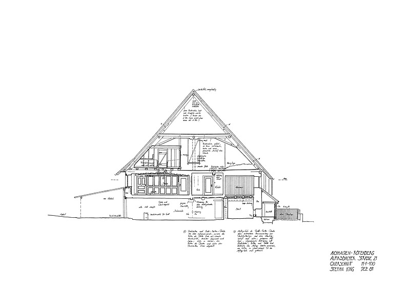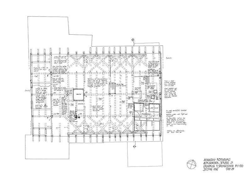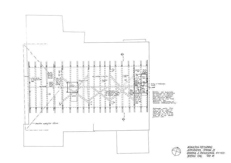 Das Dachwerk besteht aus einem liegenden Stuhl aus drei Bünden und einer mittleren Ständerreihe im 1. Dachgeschoss sowie vier liegenden Bünden im 2. Dachgeschoss. Im 1. Dachgeschoss sorgen Spannriegel und Kopfstreben für eine Queraussteifung. Nach Osten bestand ein Giebeldreieck, nach Westen ein Vollwalm.
