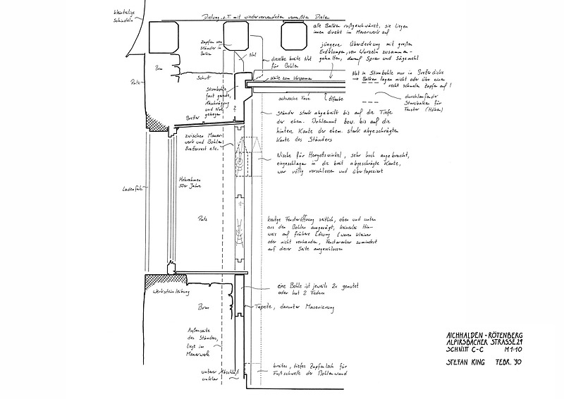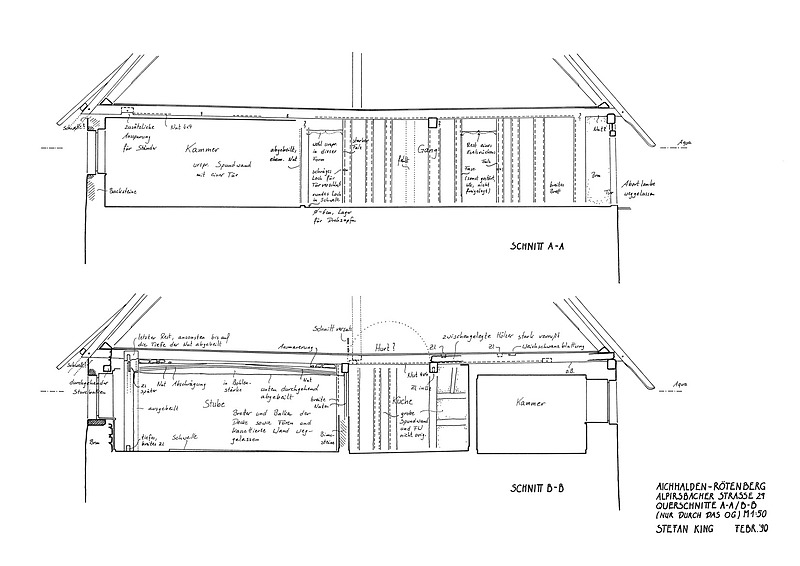 Nachträglich ausgestemmte Nische im Eckständer der Stube für einen Herrgottswinkel, bauzeitlich oder kurz danach (?). Später wurde er verschlossen. Rötenbach ist bereits seit der 1. Hälfte des 16. Jahrhunderts protestantisch.