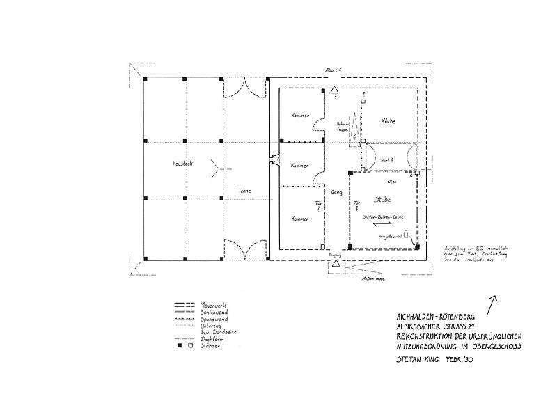 Das Wohngeschoss ist in drei Zonen aufgebaut, ursprünglich bestehend aus giebelseitiger Stube und Küche, einem Flur sowie eine Kammerzone. Daran schließen Tenne und Heulager an. Später wurde an der Rücktraufe ein Teil der Küche abgetrennt und in zwei Kammern unterteilt. Die Küche rückte näher zur Stube.