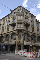 Bemerkenswert und daher an dieser Stelle nochmals angeführt, sei das Tragsystem im Bereich des Sockels. "Barthel & Maus" erklären die im Vergleich zu den übrigen Obergeschossen veränderte Struktur mit der divergierenden Raumnutzung als Geschäfts-bereich und Ladenzone: Zu diesem Zweck wurde auf eine durchgängige Flurwand verzichtet und diese in einzelne Stützen aufgegliedert. Zur ausreichenden Lastabtragung erfolgte ihr Aufbau in Stahl. Abgefangen wird das Tragsystem in der Decke des 1. Obergeschosses vermittels Stahlunterzügen. Es handelt sich um eine sog. Kleine’sche Decke, eine Stahlsteindecke, deren Einbau sich nach ihrer Patentierung im Jahr 1892 rasch etablierte und große Verbreitung fand. Bedingt also kann von einem Stahlskelettbau zumindest für den Gebäudesockel gesprochen werden, der zum originären Bestand zu zählen ist, wie nicht zuletzt die bauzeitlichen Pläne belegen. Seitz hielt auf Ihnen den Einsatz der „eisernen Säulen“ fest – ja gibt deren Durchmesser als eine der wenigen schriftlichen Anmerkungen explizit an – und skizziert den Verlauf der gleichermaßen stählernen Unterzüge. Wie die statisch-konstruktive Untersuchung zeigen konnte, ist der Bestand stählerner Stützen und Träger heute annähernd deckungsgleich mit den Bauplänen des Architekten.