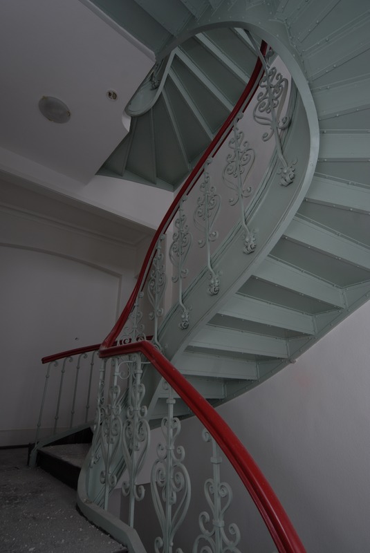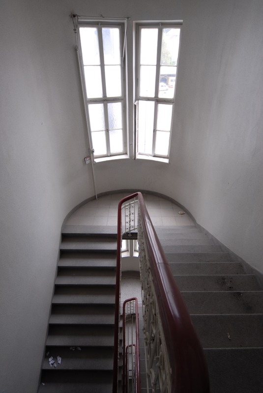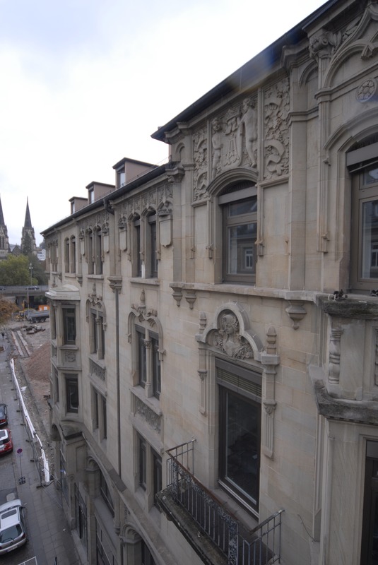 sich zwar nach wie vor bis zur Traufe, wird in seiner polygonalen Form auf Höhe des 4. Obergeschosses jedoch nunmehr von einem flachen Pyramidendach abgeschlossen. Seine einst in Form und Dekor aufwendige Gestalt wurde demnach deutlich und zu Ungunsten der bauzeitlich betonten Zentralität der Fassade reduziert.