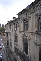 Die Fassaden sind steinsichtig gehalten und werden gekennzeichnet von einem regel-mäßigen Fugenbild der Werksteine. Verwendet wurde ebenso für das Mauerwerk wie für den Dekor Naturstein und gestärkt auf diese Weise der monochrom-uniforme Charakter des Gebäudes.