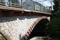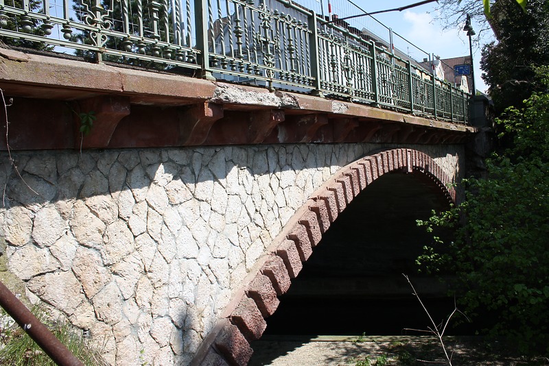 Der Anstrich blättert stark ab, es gibt einzelne Salzausblühungen und es haben sich Sinterstellen gebildet, die auf von oben eindringendes und angestautes Wasser hindeuten. An abblätternden Bereichen kommt die originale Betonwerksteinoberfläche zum Vorschein, die in Körnung und Struktur wiederum stark den hellbraun gefärbten Brückenpfeilern ähnelt, jedoch variiert die Farbe der Betonflächen an der Unterseite stark. Sicherlich muss hier damit gerechnet werden, dass auf Grund der Verwitterung/ Feuchteeinwirkung der originale Farbton des Kunststeins stark verfälscht ist. Der exakte Originalfarbton der Unteransicht lässt sich also nicht mehr feststellen. Die Stützmauern, die seitlich an die Brücke anstoßen, bestehen hauptsächlich aus Ziegelsteinen, die obere Gesteinslage bilden Kalktuffquader. Ein heller und offensichtlich kalkhaltiger Mörtel mit rundlicher Flusssandkörnung wurde zum Vermauern der Steine verwendet. Es gibt im Mauerwerk mehrere große, erkennbare Reparaturphasen, bei denen zum einen Ziegel im selben Format verwendet wurden wie der Originalbestand, der Mauermörtel jedoch ein grauer Zementmörtel ist.