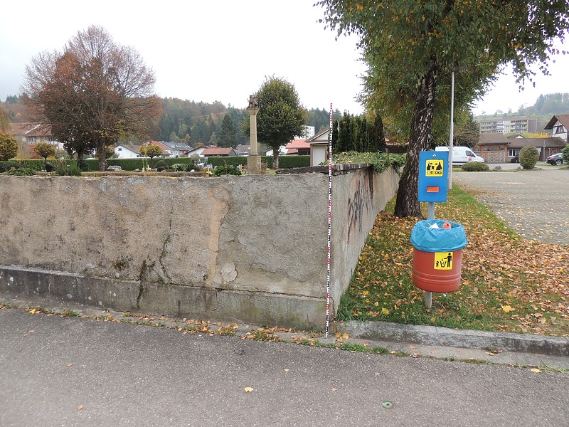 Bei der Friedhofsmauer handelt es sich um eine ca. 50 cm dicke und durchschnittlich 1,4 m hohe Mauer mit einer ursprünglichen Länge von 210 m. Da in Dokumenten von 1939 eine Länge von 280 m angegeben ist und die Lücke an der Ostseite ca. 70 m beträgt, ist davon auszugehen, dass der fehlende Abschnitt in der Zeit zwischen 1939 und 1949 abgebrochen wurde.