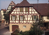 Stattlicher, zweistöckiger Fachwerkbau mit Krüppelwalmdach in Ecklage (Flügelbau), EG massiv, mit Eckquaderung, getreppter Steinknagge und Zweischneuß (Schmuckform auf der Ostseite), mit Rundbogen Kellertor, bezeichnet "1572" (i) und Tür bezeichnet "1752" (i), sowie Kellergewölbe.
