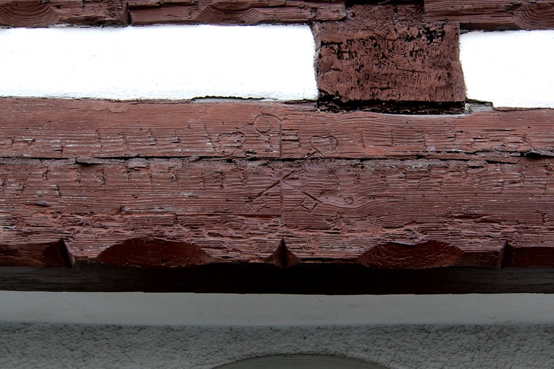 Unterzug mit ausgestemmtem Wappen (Hirtenstab mit gekreuztem, Binde-und Löseschlüssel) / Ehem. Mühle in 88697 Bermatingen (05.02.2013 - A. Kuch)