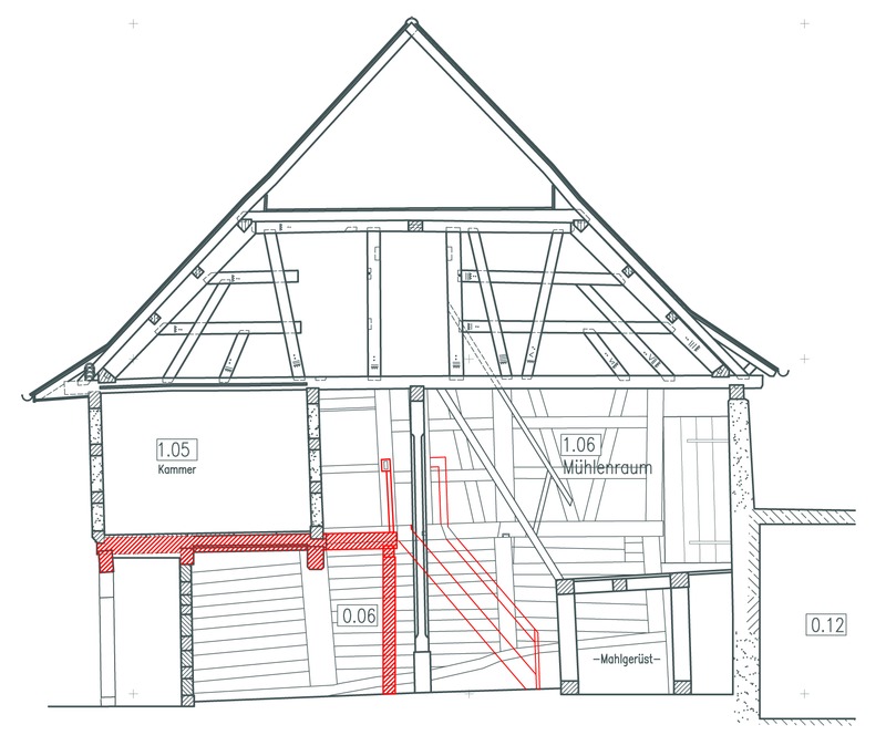 Querschnitt durch den Mühlenteil (rot: Rekonstruktion des einstigen Umgangs) / Ehem. Mühle in 88697 Bermatingen (20.03.2013 - A. Kuch)