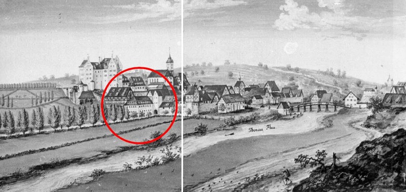 Die älteste datierte Erfassung des Baus, ein nach Westen ausgerichteter Lageplan von 1804, zeigt den Bereich östlich des Schlosses. Verzeichnet sind zwischen Schloss und südlichem Tor ein Gruppe von drei Gebäuden: der „Herrschaftliche Frücht-Kasten“, die winkelförmige „Herrschaftl. Scheuer“ und daran südlich angrenzend der „Herrschaftliche Neubau“. Der Situierung nach zu urteilen handelte es sich beim letzteren um das spätere Spital. Das Gebäude war anscheinend nur vom Schlossbezirk zugänglich. Ein Zugang von der Stadt oder der Zugang zum Hof von außen waren aufgrund der angrenzenden Scheuer und der Stadtmauer nicht möglich. Eine historische Stadtansicht von 1803 zeigt den Masarddachbau mit Dachgauben auf der Ost- und der Südseite.