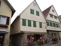 Zweigeschossiges verputztes Wohnhaus, Obergeschoss auf einer Traufseite stark vorkragend, massives Erdgeschoss mit Ladeneinbau, im Kern 16. Jahrhundert.
