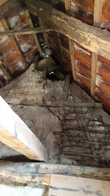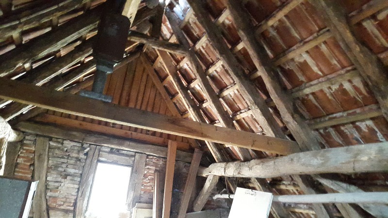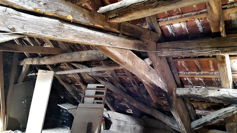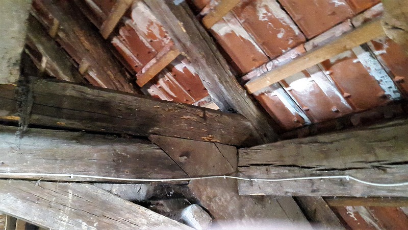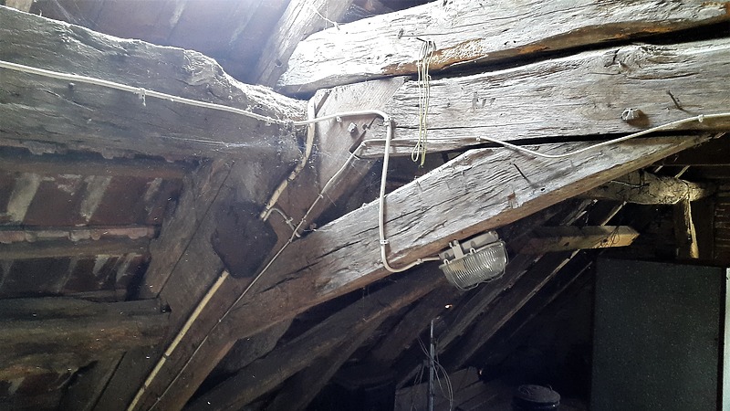 Besonders auffällig sind die Fäulnisschäden im nicht ausgebauten Spitzboden – trotz einiger zimmermannsmäßiger Reparaturen dürfte die Standfestigkeit immer mehr in Zweifel gezogen werden.