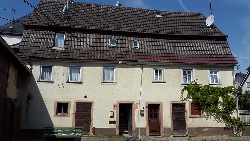 Ähnlich wie die vordere Doppelhaushälfte (Gissigheimer Str. 31) befindet sich das Gebäude insgesamt in einem sehr schlechten Zustand, denn besonders im UG befinden sich stark fäulnisgeschädigte bzw. schädlingsbefallene Deckenbalken und diverse durchfeuchtete Wand- und Bodenflächen.