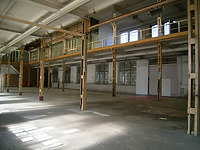 Werkhallen mit Stützenkonstruktionen und seitlich und auf Galerien angeordneten Nebenräumen. Verwaltungsbau mit Bürounterteilungen auf allen Geschossen.