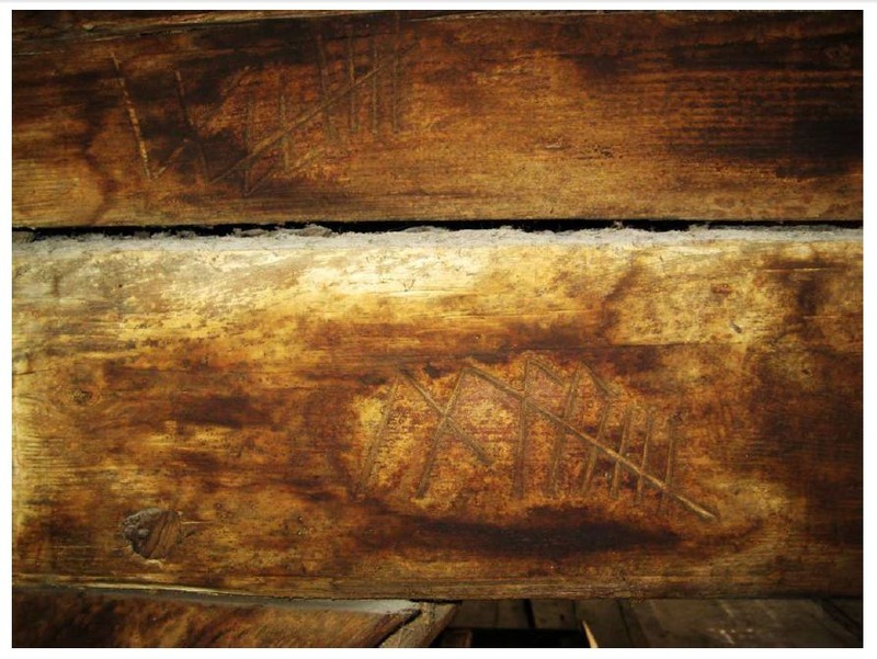 Abbundzeichen auf einer doppelten Kehlbalkenlage zwischen 1. und 2. DG (2011) / Altes Bezirksrathaus, Rathaus in 70372 Stuttgart, Bad Cannstatt (strebewerk)