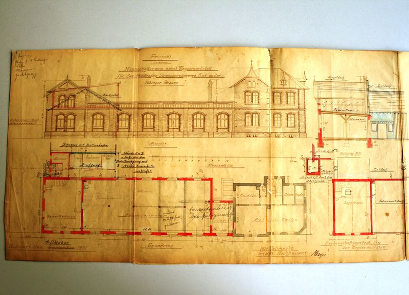 Tübinger Straße im September 1901 die Pläne vorgelegt wurden. Abgesehen von wenigen, vorzugsweise die Binnengliederung betreffende Änderungen im Oktober desselben Jahres, wurden auf dieser Plangrundlage der eingeschossige Riegel sowie das östlich den Bau abschließende, zweigeschossige Gebäude mit Satteldach errichtet. Dabei erfolgte stilistisch zwar keine absolute, dennoch aber weitgehende Orientierung am zehn Jahre älteren Bestand, sodass das in zwei unabhängigen Bauprojekten errichtete Gebäude insgesamt sehr einheitlich erscheint. Dieser Eindruck resultiert vor allem aus der Material- und Farbwahl, d.h. der erneuten Verwendung ockerfarbener Ziegelsteine für die großen Flächen und roter für architektonische Details. Letztere umfassen die Lisenen zur Unterteilung der Fensterachsen im Bereich des Riegels sowie Sturzbögen, Gesimse und Profile am gesamten Gebäude, das auf diese Weise in Bezug auf das Relief wie die Farbe akzentuiert wird.