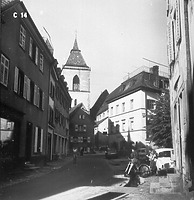Straßenansicht in Staufen; im Hintergrund der Turm der katholischen Pfarrkirche St. Martin (1965) / Kath. Pfarrkirche St. Martin, Kirchturm in 79219 Staufen, Staufen im Breisgau (Bildindex Foto Marburg, Foto: E. Groth-Schmachtenberger; Aufnahme-Nr. B 14.937/3; Aufn.-Datum: 1965)