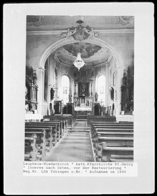 Seit dem 15. Jahrhundert ist der heilige Georg als Kirchenpatron bezeugt, seit etwa 1500 auch der heilige Sebastian. Die beiden Nebenaltare wurden den beiden Kirchenpatronen geweiht und die Madonnenfigur zu Beginn des 16. Jh. auf den Hochaltar versetzt. 1610 durch diese durch die noch heute vorhandene Marienstatue von Hans Dürner aus Biberach ersetzt.