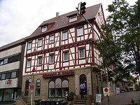 Dreigeschossiges Fachwerkhaus in Ecklage, Erdgeschoss massiv aus Quadersteinen mit Rundbogenöffnungen, Obergeschosse mit Fachwerk, Satteldach, um 1600, Erdgeschoss 1851 massiv ersetzt, 1969 Freilegung des Fachwerkes.