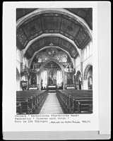 Dreischiffiges Kircheninnere; Mittelschiff gegenüber den Seitenschiffen höher und breiter, überfangen von einer mit Holz gedeckten Ringtonne, durch Gurtbögen unterteilt; flach gedeckter Chor mit Deckengemälde.