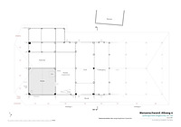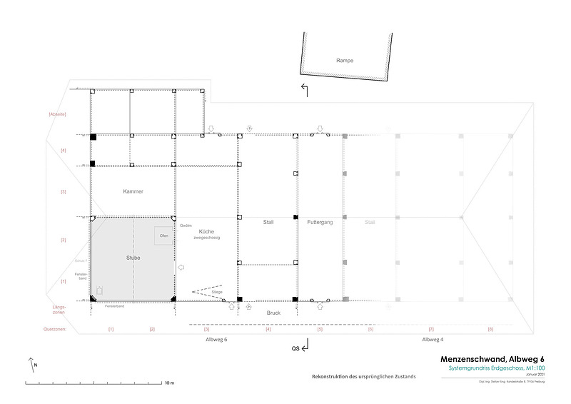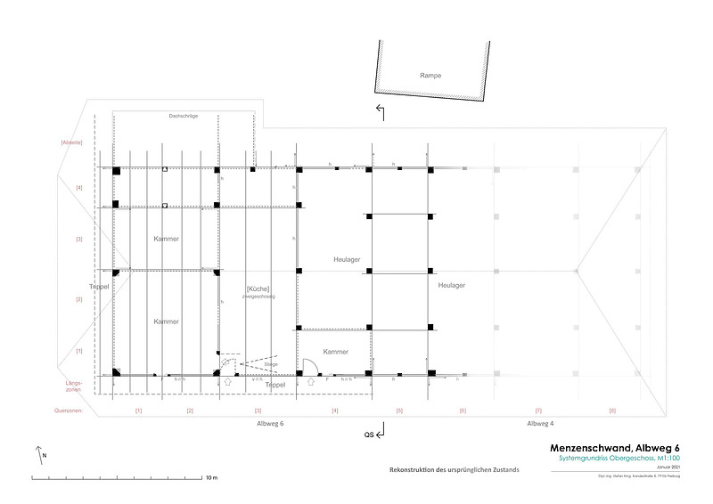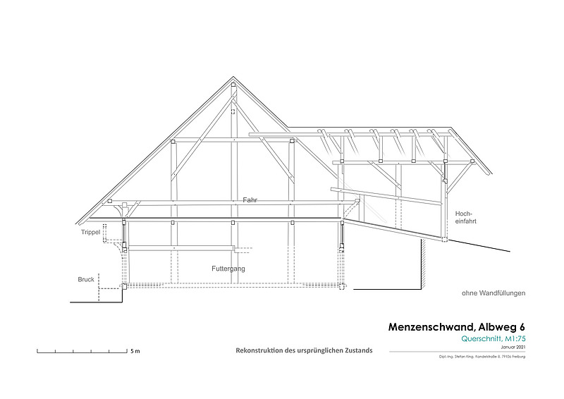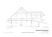Während im Keller die gemauerte Außenwand an der Längsseite etwa bündig zum Holzgerüst liegt, tritt sie an der Schmalseite weit vor dessen Flucht vor und weist zudem eine größere Mauerstärke auf.