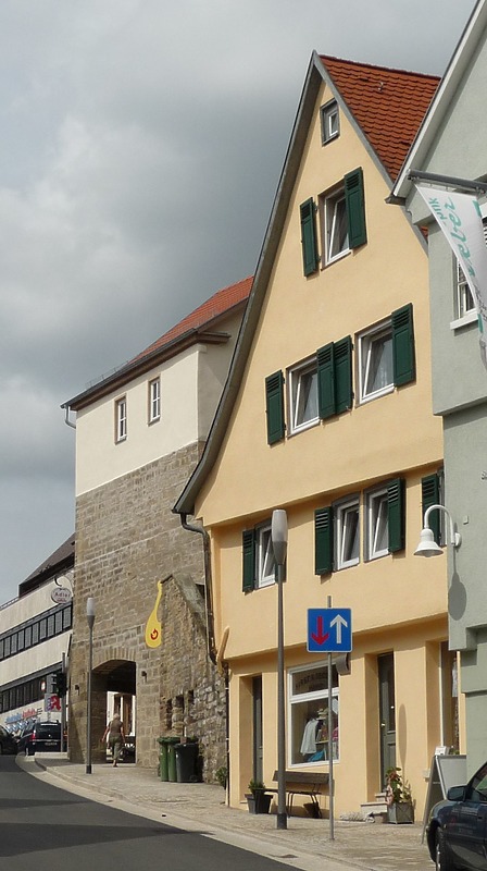 Zweistöckiges Wohnhaus mit Kellergewölbe und Giebeldach am Torrain, verputztes Fachwerk, mit der Rückseite an die Innere Stadtmauer angebaut: Die ehemalige Stadtschmiede vor 1660. Das Gebäude hatte einst Stallung und Werkstatt im Erdgeschoss. (a)
