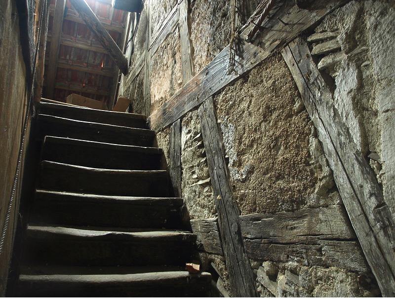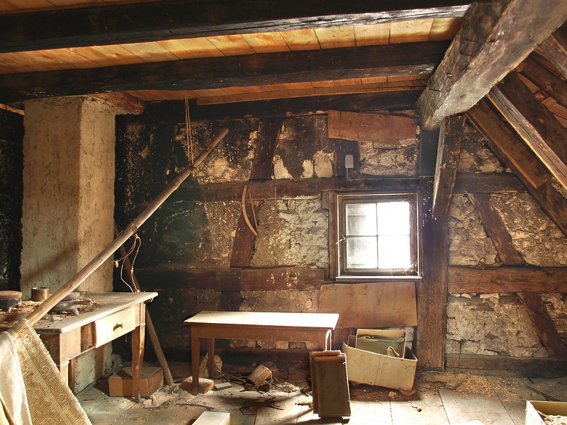 Vom Obergeschoss ins Dach führt eine Blocktreppe, die ihrer Machart wegen auf die Bauzeit zurückgehen dürfte. Die heutige Dachdeckung wird von maschinell hergestellten Falzziegeln gebildet.