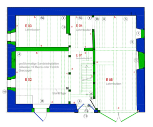 Im westlichen Teil des Erdgeschosses gibt es im nördlichen Bereich einen ehemaligen Stall, der über eine zweite Türe in der Außenwand und über den Treppenraum zugänglich ist. Der kleinere Raum in der südöstlichen Ecke ist vom hinter dem Treppenhaus liegenden Raum E.04 betretbar.