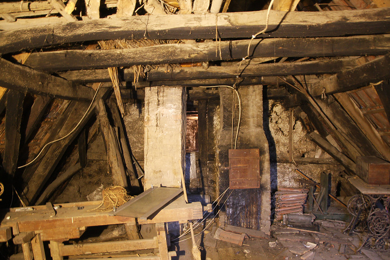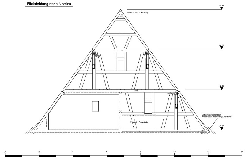 Starke Rußspuren sowie Versottungen deuten darauf hin, dass es sich bei dem Dachtragwerk um ein ehemaliges Rauchdach handelte. Dafür spricht auch ein kleines Firstfach bzw. "Rauchloch" am Nordgiebel. Eine mittig angeordnete Binnenwand trennte die Dachräume des 2. und 3. DG in einen rauchfreien und einen rauchigen Dachbereich auf. Da die Versottungen in der mittleren Querzone konzentriert auftreten, befand sich hier vermutlich die Küche (Flurküche).
