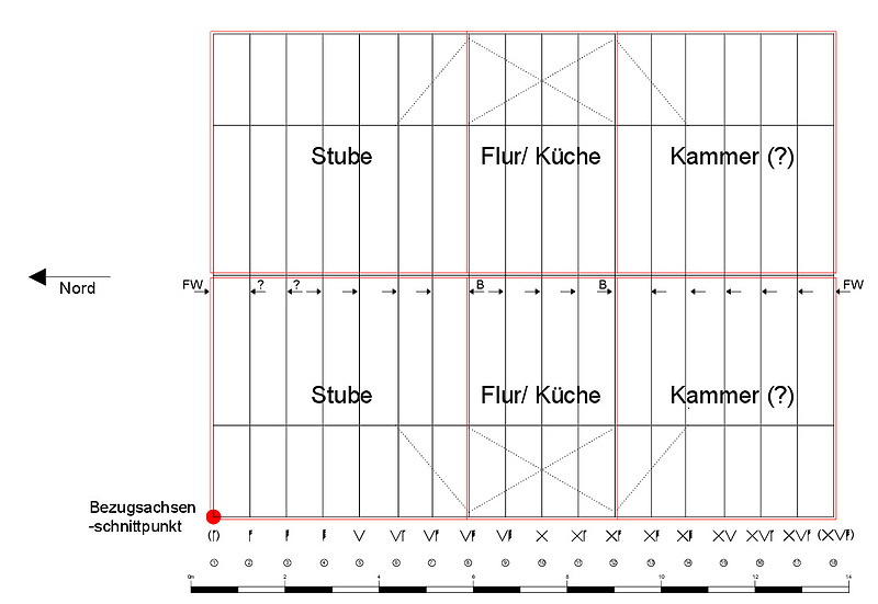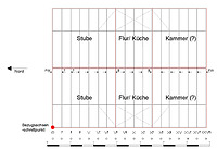 Anhand des Abbundzeichensystems und den Bundseiten können Aussagen über die frühere Nutzung getroffen werden. Da die Bundseiten der Binnenwände in der mittleren Querzone zueinander zeigen, weisen sie diese Querzone als Flur aus. Folglich wurde die mittlere Querzone schon zur Erbauungszeit für die Erschließung genutzt. Da die Gespärrezählung im Norden beginnt, kann über den Bezugsachsenschnittpunkt davon ausgegangen werden, dass sich früher hier die Stube befand. Dafür spricht auch die Lage zur Straße.