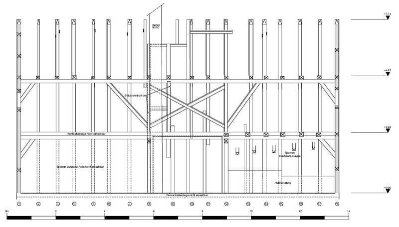 Die dendrochronologische Untersuchung datiert die Errichtung des Gebäudes in das Jahr 1551 (d). Das deckt sich mit den gefügekundlichen Details. Die geblatteten und gezapften Kehlbalken sowie Bandstreben sind charakteristisch für die Übergangszeit von den Blatt- zu den Zapfenverbindungen.