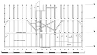 Die Längsaussteifung des Dachwerkes erfolgt über Windverbandsstreben. Diese sind an den außenliegenden Feldern fußzonig in die Stuhlstreben eingezapft und kopfzonig an die Rähme angeblattet. In den mittleren Feldern sind die Windverbandsstreben als Andreaskreuze ausgebildet und kopf- und fußzonig an die Stuhlstreben gezapft.