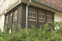 Beide Baukörper waren ursprünglich ab Oberkante Keller bzw. Grundmauer durchgehend aus Eichenfachwerk errichtet und mit einem auf senkrechte Stakung und waagrechtes Rutengeflecht aufgebrachten, etwa 12-14 cm dicken Lehm-Stroh-Gemisch ausgefacht (sog. Krettenmacherwand). Keine Kratzornamente. Das Haus wurde im Lauf der Zeit zweimal verputzt, wobei sich der normale Putz außerordentlich gut in den Gefachen gehalten hat, da Kälberhaare in den Kalkputz gemengt wurden, die diesem hohe Elastizität verleihen.