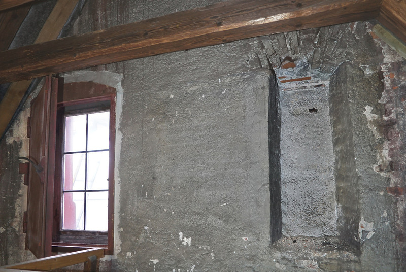 Unweit links des Fensters im 3. Dachgeschoss sind die Umrisse einer vermauerten Öffnung zu erkennen, die bei gleicher Höhe aber nur eine Breite von 27 cm besaß. Innenseitig entspricht ihr eine schmale, ebenfalls stichbogig gewölbte Nische. Während die anderen Fenster mit Laden und/oder Fensterflügel verschlossen werden konnten, handelte es sich hier offenbar um eine offene Schlitzöffnung, die vermutlich eine Dauerbelüftung des Dachraums gewährleisten sollte. Auch innerhalb der westlichen Giebelseite findet sich eine solche Einrichtung, heute freilich ebenfalls mit einer Brandschutztür versehen.