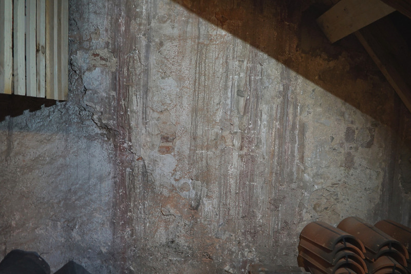 Ein Stück oberhalb der Dachschräge ist rechts der Durchgangstür eine weitere Schräge zu sehen, womöglich der Abdruck eines Dachs. Oberhalb der vermeintlichen Fehlstelle des Kaminkopfs hat sich hingegen eine deutliche Putzbraue erhalten, die mit jener weiter unten in Zusammenhang stehen könnte. Unklar ist, ob es sich tatsächlich um den Abdruck eines leicht erhöhten Gebäudes handelt.