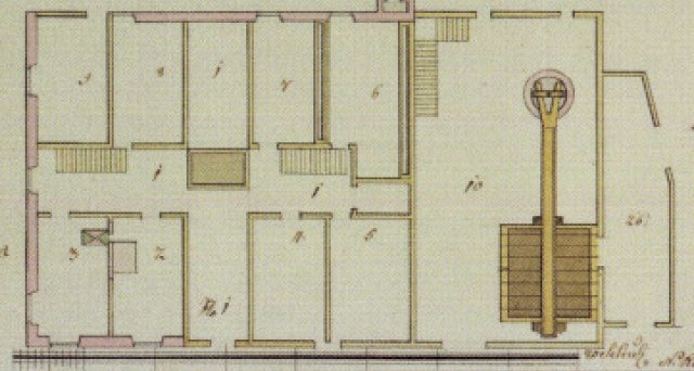 Bestandspläne von 1803 zeigen eine sich in Erd -und Obergeschoss weitgehend wiederholende siebenzonige und dreischiffige Grundrissgliederung. Mittellängsflurerschließung. Ursprünglich südseitiger Haupteingang mit Außentreppe und anschließendem gebäudetiefem Querflur.