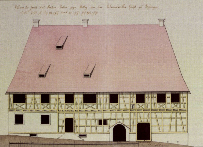 -Errichtung des ursprünglich in Stockwerksbauweise abgezimmerten Gebäudes mit großem Torkelraum im Osten; vermutlich unter Verwendung des Gewölbekellers eines älteren Vorgängerbaus entlang der Südseite.