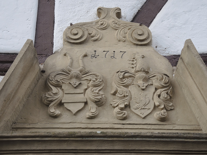 Die Massivgeschosse sind durch sandsteinerne Eckquaderungen und geohrte Fenstergewände akzentuiert. Besonders erwähnenswert ist hier das nördliche Rundbogentor mit der Datierung 1618 und die östliche Freitreppe mit dem reich gestalteten Eingangsportal mit Datierung 1717. Die Fachwerkfassaden im Obergeschoss zeigen K-Streben. Das nördliche Giebelfachwerk dagegen aufwändige Zierelemente wie geschweifte Andreaskreuze, Kopfwinkelhölzer und Rautenfelder.
